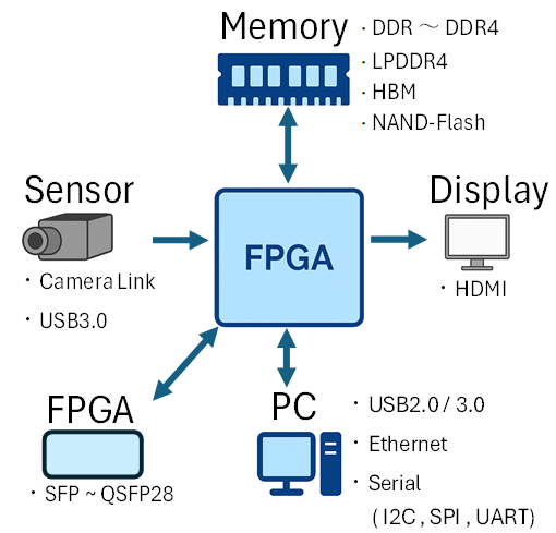 【LSI】 ・カメラ制御関連の設計 (FPD-Link , Mipi-CSI2(D-PHYを含む) , SLVS-EC) ・System-Bus構築 (Arteris社製 FlexNocを使用) ・DDRメモリ I/F の設計 (Synopsys社製 DDR PHY/Link IPを使用) ・各種IP(通信・メモリ など)の調査、カスタマイズ、および実装設計 【FPGA】 ・カメラを用いた画像処理 ・高速I/Fを用いたデータ転送 ・周辺I/Fの設計(下図を参照)